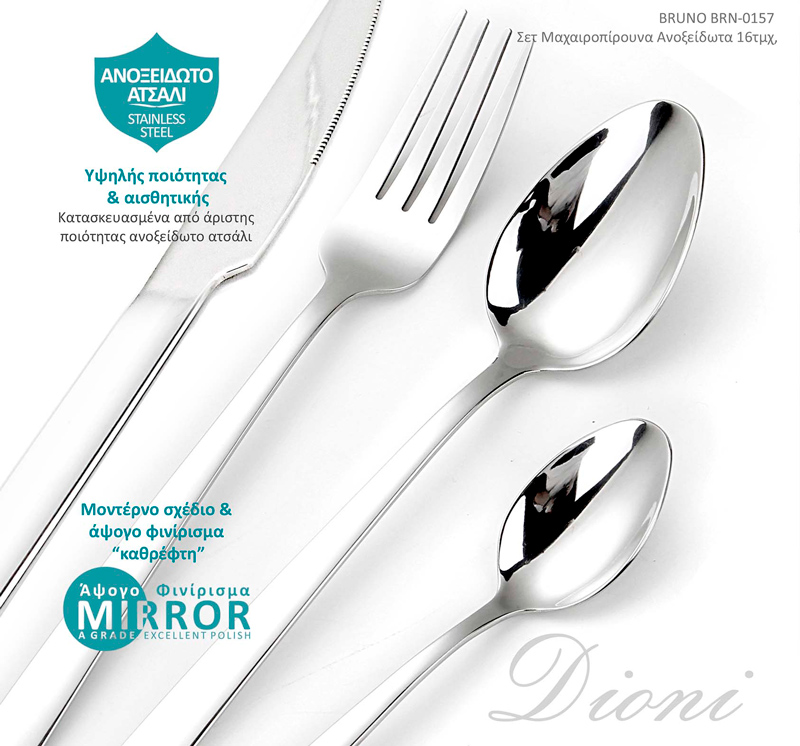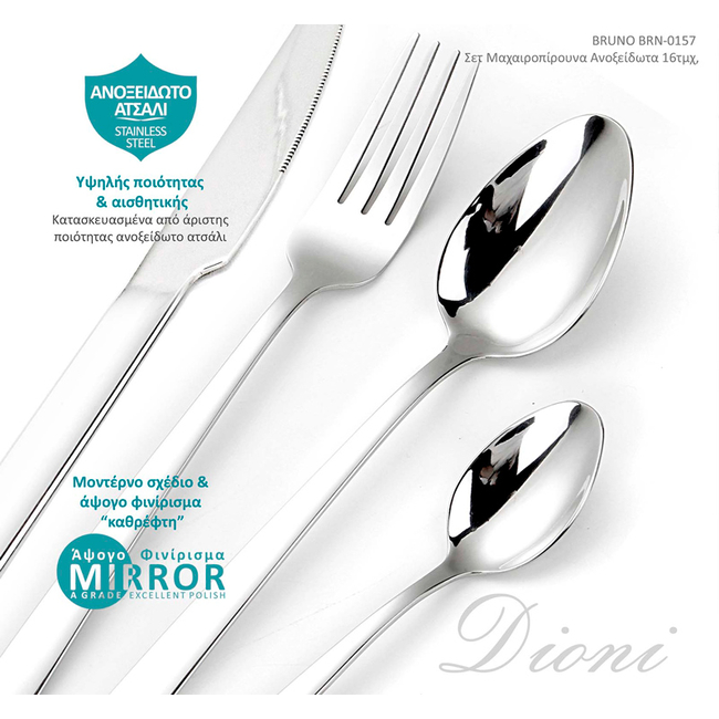 Σετ μαχαιροπίρουνα 16 τεμαχίων Dioni από την Bruno, υψηλής ποιότητας και αισθητικής, κατασκευασμένα από άριστης ποιότητας ανοξείδωτο ατσάλι σε μοντέρνο σχέδιο και άψογο φινίρισμα "καθρέφτη".