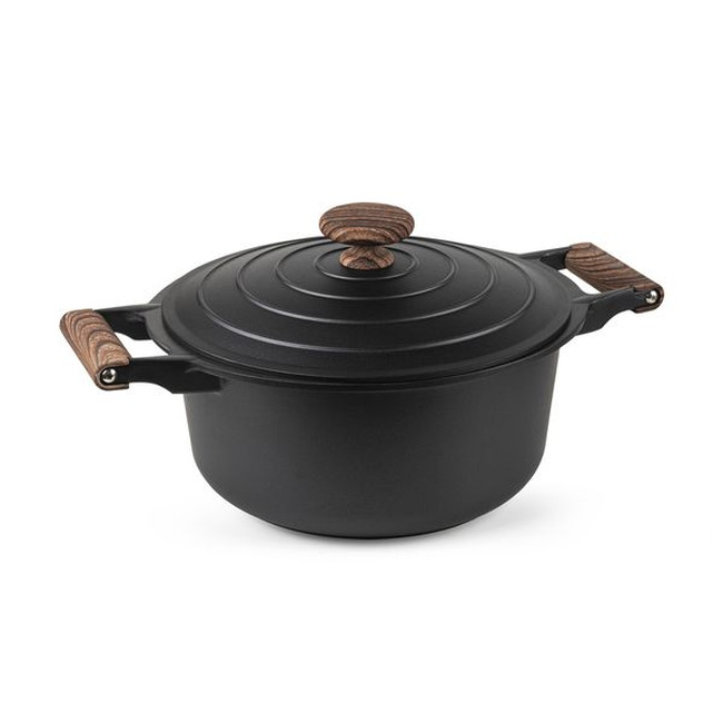 - Σκεύος κατασκευασμένο από χυτό αλουμίνιο, Τριπλά ενισχυμένη εσωτερική αντικολλητική επίστρωση PFLUON ETERNUM, ιδιαίτερα ανθεκτική στη σκληρή χρήση ,Εργονομικές λαβές βακελίτη με φινίρισμα ξύλου για σταθερό κράτημα και άνετο μαγείρεμα,Χωρίς PFOA, χωρίς κάδ