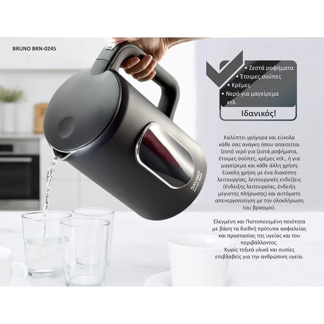 Ο ψηφιακός βραστήρας προηγμένων λειτουργιών BRUNO BRN-0245 καλύπτει γρήγορα και εύκολα κάθε σας ανάγκη όπου απαιτείται ζεστό νερό για ροφήματα, έτοιμες σούπες, κρέμες κτλ., ή για μαγείρεμα και κάθε άλλη χρήση.