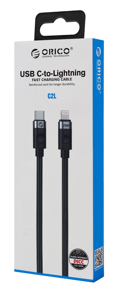 Καλώδιο φόρτισης και μεταφοράς δεδομένων Lightning σε USB-C της ORICO. Υποστηρίζει φόρτιση με απόδοση έως 29W και μεταφορά δεδομένων με ταχύτητα έως 480Mbps.