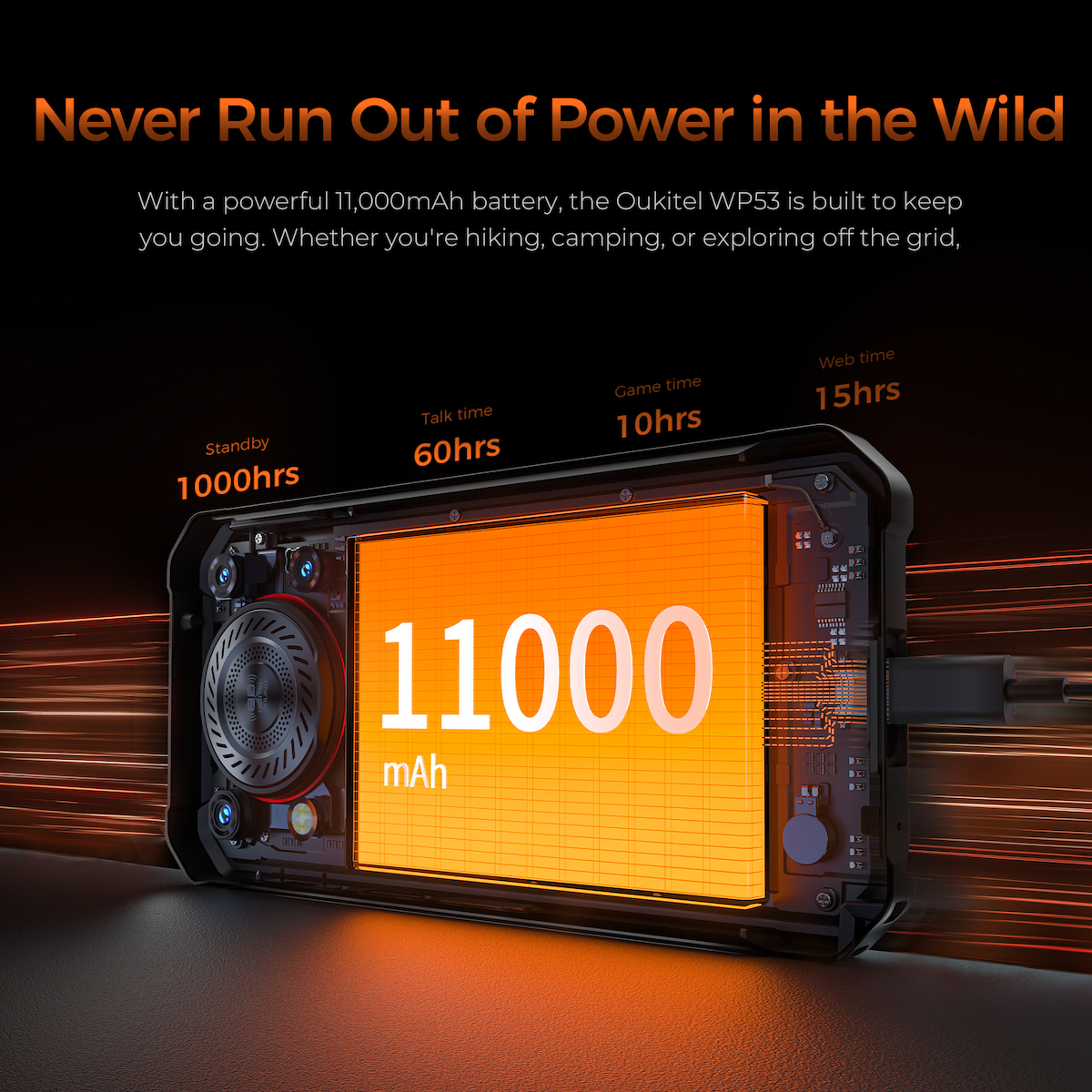 Με μπαταρία 11000mAh, το WP53 προσφέρει εξαιρετικά μεγάλη αυτονομία, που θα σας απαλλάξει από τις συχνές αναζητήσεις τροφοδοσίας.