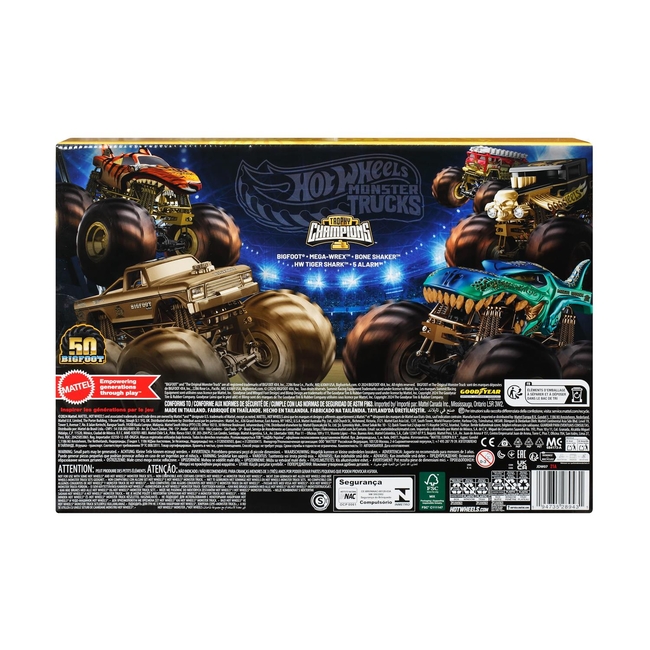 Το σετ περιλαμβάνει πέντε εμβληματικά monster trucks και έξι Hot Wheels αυτοκινητάκια, καθώς και ένα αξεσουάρ κύπελλο πρωταθλήματος, όλα διακοσμημένα με χρυσές λεπτομέρειες που γιορτάζουν την κληρονομιά του Bigfoot. Κάθε όχημα παρουσιάζεται σε ειδική συσκευασία που είναι ιδανική για επίδειξη και παιχνίδι.