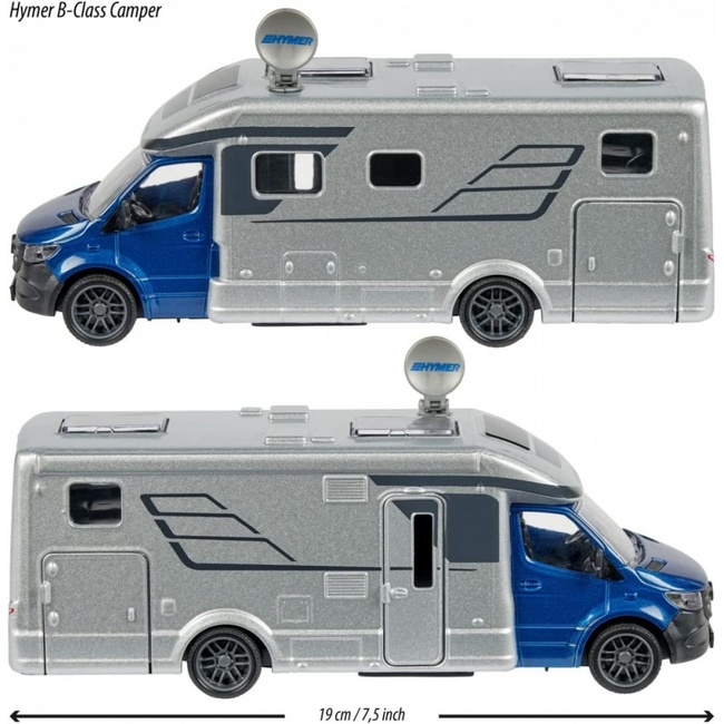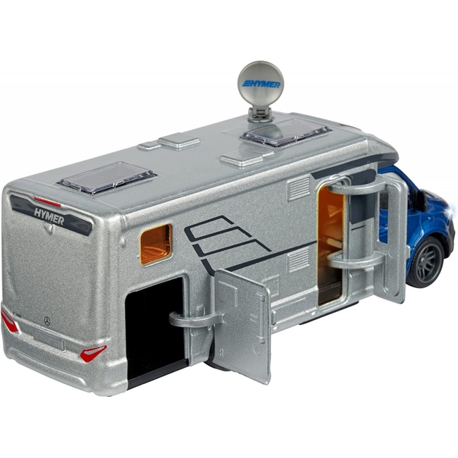 The metal Hymer B:Class camper has light and sound functions. The vehicle has opening doors, a movable aerial and soft rubber tyres. Length: 19 cm.