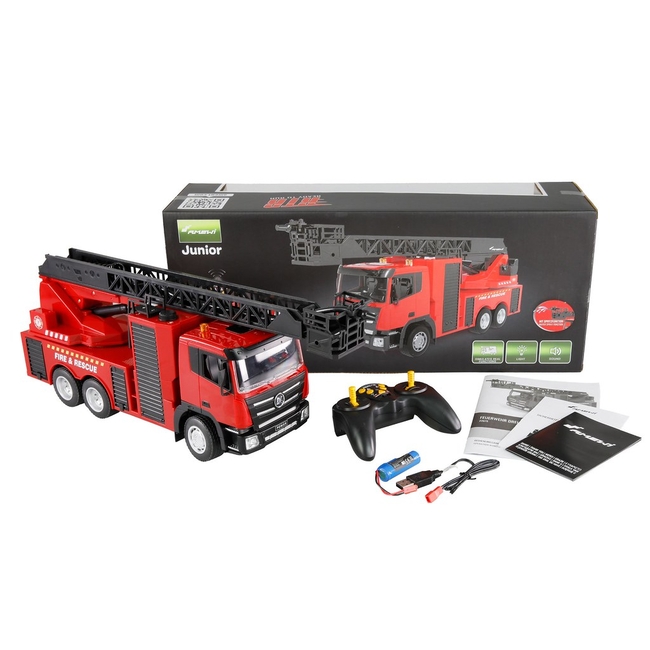 Το Amewi Feuerwehr Drehleiterfahrzeug 1:18 RTR είναι ένα προσεκτικά κατασκευασμένο τηλεκατευθυνόμενο μοντέλο ενός πυροσβεστικού οχήματος με ανακλινόμενη σκάλα.