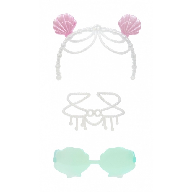 - Γοητευτικά Αξεσουάρ: Περιλαμβάνει sea shades, ένα θαλάσσιο κοχύλι και μια εντυπωσιακή tiara με πέρλες.