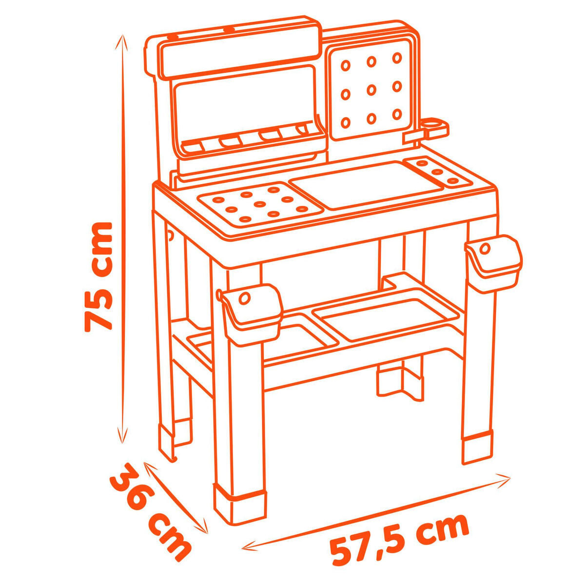 Ο Smoby Black & Decker Pro Workbench (γνωστός και ως Bricolo Pro Workbench) είναι παιδικός πάγκος εργασίας και εργαλεία παιχνιδιού για ηλικίες 3-6 ετών. Διαθέτει ρεαλιστικό σχεδιασμό Black & Decker, κατασκευή στη Γαλλία και χρήση ανακυκλωμένου πλαστικού σε ποσοστό τουλάχιστον 60-65%. Περιλαμβάνει 7 εργαλεία, όπως πριόνι, σφυρί, γαλλικό κλειδί, κατσαβίδι, πένσα, γωνιόμετρο και σφιγκτήρα, καθώς και ηλεκτρικό κατσαβίδι-απομίμηση με μηχανική λειτουργία βιδώματος. Προσφέρει επιφάνεια εργασίας για δημιουργικό παιχνίδι, σετ κατασκευών για συναρμολόγηση οχημάτων και λειτουργία παιχνιδιού με καρφάκια. Είναι σχεδιασμένος για ανάπτυξη δεξιοτήτων DIY και μίμηση πραγματικών εργασιών, με σταθερή κατασκευή και χωρίς πλαστική συσκευασία.