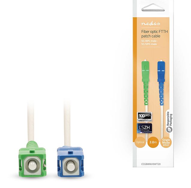 Καλώδιο μονότροπης οπτικής ίνας (OS2), SC-APC αρσ. - SC-UPC αρσ., 2.00m σε λευκό χρώμα.Το patch καλώδιο της Nedis είναι κατάλληλο τόσο για οικιακές όσο και για βιομηχανικές εφαρμογές, συμπεριλαμβανομένης της εγκατάστασης οπτικής ίνας στο σπίτι (FTTH) και επίσης, είναι συμβατό με τις FTTH επιλογές ενός ευρέος φάσματος παρόχων τηλεπικοινωνιών. Σας δίνει τη δυνατότητα υποστήριξης υψηλού εύρους ζώνης, κάλυψη μεγαλύτερων αποστάσεων και πιο γρήγορη μετάδοση δεδομένων, χωρίς αυξημένη εξασθένηση και παρεμβολές. Τέλος, είναι τύπου Simplex, δηλαδή έχει μια ίνα και έναν σύνδεσμο σε κάθε άκρο.Χαρακτηριστικά:- Καλώδιο οπτικής ίνας mono-mode σχεδιασμένο για τύπους συνδέσεων όπως FTTH, FTTB, FTTx- Ιδανικό για χρήση στο σπίτι, στο γραφείο, σε κέντρα δεδομένων κ.λπ.- Το patch καλώδιο διευκολύνει τη σύνδεση μεταξύ του σημείου μεταφοράς του σπιτιού και του τερματικού οπτικού δικτύου (ONT), σε εσωτερικούς χώρους- Καλώδιο οπτικής ίνας για μεταφορά δεδομένων έως και 100 Gbit/s- Ιδανικό για υψηλής ταχύτητας internet- Περίβλημα καλωδίου LSZH, απαλλαγμένο από αλογόνο που προσφέρει καλύτερη πυροπροστασία - Εξοπλισμένο με καπάκια προστασίας από τη σκόνη- Χωρίς ηλεκτρικές και μαγνητικές παρεμβολές- Σύνδεση 1: SC-APC αρσ.- Σύνδεση 2: SC-UPC αρσ.- Τύπος οπτικής ίνας: Glass Fiber G657.A2- Μήκος: 2.00 m- Διάμετρος καλωδίου: 3 mm- Διάμετρος αγωγού: 1 x 1.50 mm²- Διάμετρος ίνας: 9/125m- Μέγιστο εύρος ζώνης: 100 Gbps- Κεραμικός κονέκτρορας- Προστασία από τσάκιση- Μήκος κύματος: 1310 nm- Μονότροπη ίνα (OS2)- Μέγιστη ακτίνα κάμψης: 30°- Κατασκευή καλωδίou: Simplex- Μανδύας καλωδίου: LSZH- Υλικό αγωγού: Οπτική ίνα- Χρώμα: Λευκό- Θερμοκρασία λειτουργίας: -20°C - 70°C- Συσκευασία: Paperbox with hook