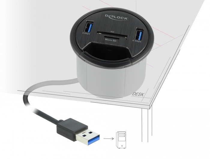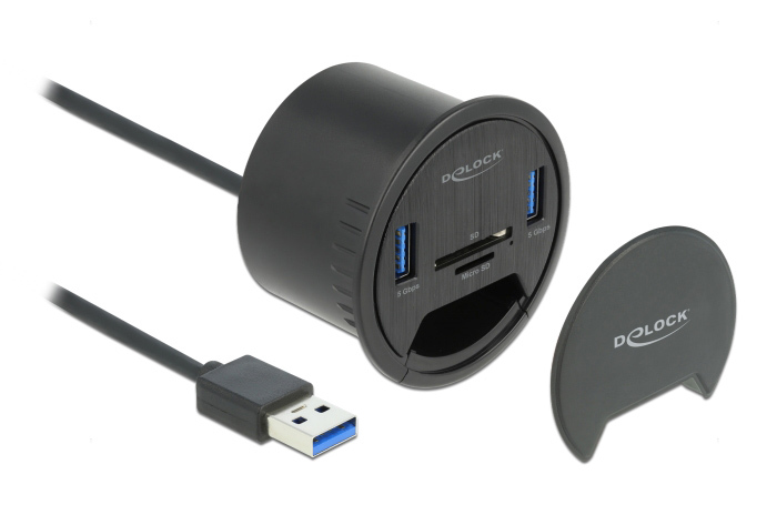 Αυτό το USB hub της Delock μπορεί να τοποθετηθεί σε μια υπάρχουσα εγκοπή στο γραφείο σας και να συνδεθεί με τον υπολογιστή σας μέσω θύρας USB για να επεκτείνει τις θύρες του με 2x USB 3.2, SD και micro SD θύρες.
