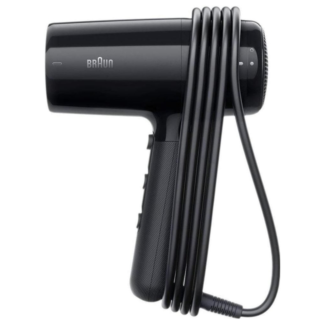 Το πιστολάκι διαθέτει μήκος καλωδίου 2,2 μ. και έρχεται σε μια κομψή μονόχρωμη μαύρη επιφάνεια. Είναι σχεδιασμένο χωρίς ενσωματωμένη οθόνη, επικεντρώνοντας στη λειτουργικότητα και την αποδοτικότητα.