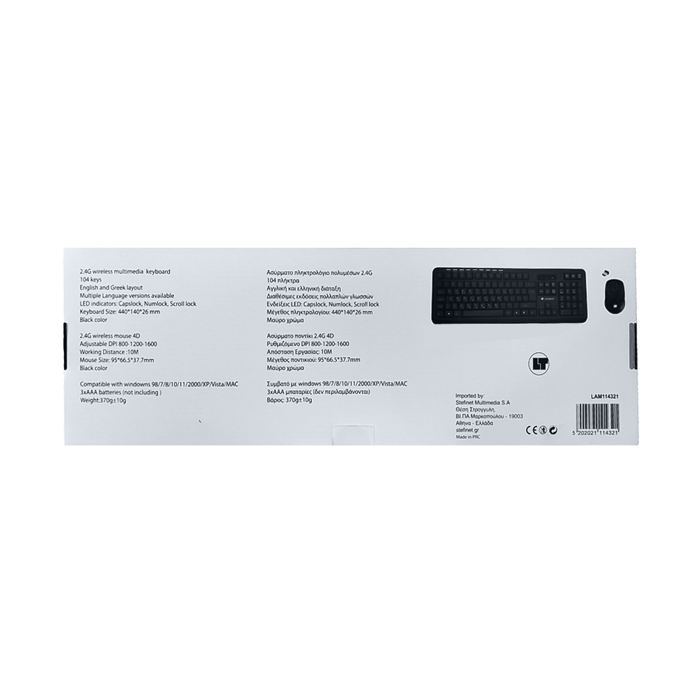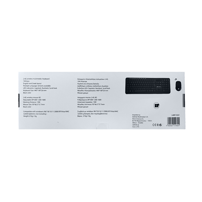 <strong>Σετ Ασύρματο Πληκτρολόγιο &amp; Ποντίκι 2.4G – Πολυγλωσσική Υποστήριξη  |   <span style="color: #3366ff;"><a style="color: #3366ff;" href="https://drive.google.com/file/d/1HA-UWHWIslgAzPr25Gm0rCabhpJqlTtV/view?usp=sharing" target="_blank" rel="noopener">EU ΔΗΛΩΣΗ ΣΥΜΜΟΡΦΩΣΗΣ</a></span></strong>Αναβαθμίστε την εμπειρία εργασίας σας με το πλήρες σετ ασύρματου πληκτρολογίου και ποντικιού 2.4G. Κατάλληλο για καθημερινή χρήση στο σπίτι ή το γραφείο, προσφέρει εργονομικό σχεδιασμό, ακρίβεια και άνεση.<strong>Χαρακτηριστικά Πληκτρολογίου:</strong><ul> <li><strong>Διάταξη:</strong> 104 πλήκτρα με υποστήριξη Αγγλικής και Ελληνικής γλώσσας, καθώς και επιλογή πολλαπλών γλωσσών.</li> <li><strong>Ενδείξεις LED:</strong> Ενημερωθείτε εύκολα για τις λειτουργίες Caps Lock, Num Lock και Scroll Lock.</li> <li><strong>Μέγεθος:</strong> Συμπαγές και κομψό, διαστάσεων 440 x 140 x 26 mm.</li> <li><strong>Σχεδιασμός:</strong> Μαύρο χρώμα για μοντέρνα και διακριτική εμφάνιση.</li></ul><strong>Χαρακτηριστικά Ποντικιού:</strong><ul> <li><strong>Τεχνολογία 2.4G 4D:</strong> Προσφέρει σταθερή ασύρματη σύνδεση με απόσταση εργασίας έως 10 μέτρα.</li> <li><strong>Ρυθμιζόμενο DPI:</strong> Επιλέξτε μεταξύ 800, 1200 και 1600 DPI για ακρίβεια ανάλογα με τις ανάγκες σας.</li> <li><strong>Μέγεθος:</strong> Εργονομικός σχεδιασμός, διαστάσεων 95 x 66.5 x 37.7 mm.</li> <li><strong>Σχεδιασμός:</strong> Μαύρο χρώμα για επαγγελματική αισθητική.</li></ul><strong>Γενικά Χαρακτηριστικά:</strong><ul> <li><strong>Συμβατότητα:</strong> Λειτουργεί άψογα με Windows 98/7/8/10/11/2000/XP/Vista και MacOS.</li> <li><strong>Μπαταρίες:</strong> Λειτουργεί με 3xAAA μπαταρίες (δεν περιλαμβάνονται).</li> <li><strong>Βάρος Σετ:</strong> 370g ±10g.</li></ul>Το ιδανικό σετ για επαγγελματίες και λάτρεις της τεχνολογίας που αναζητούν ποιότητα και άνεση στην εργασία ή την ψυχαγωγία.Ασύρματο πληκτρολόγιο πολυμέσων 2.4G104 πλήκτραΑγγλική και ελληνική διάταξηΔιαθέσιμες εκδόσεις πολλαπλών γλωσσώνΕνδείξεις LED: Capslock, Numlock, Scroll lockΜέγεθος πληκτρολογίου: 440*140*26 mmΜαύρο χρώμαΑσύρματο ποντίκι 2.4G 4DΡυθμιζόμενο DPI 800-1200-1600Απόσταση Εργασίας: 10MΜέγεθος ποντικιού: 95*66.5*37.7mmΜαύρο χρώμαΣυμβατό με windows 98/7/8/10/11/2000/XP/Vista/MAC3xAAA μπαταρίες (δεν περιλαμβάνονται)Βάρος: 370g±10g