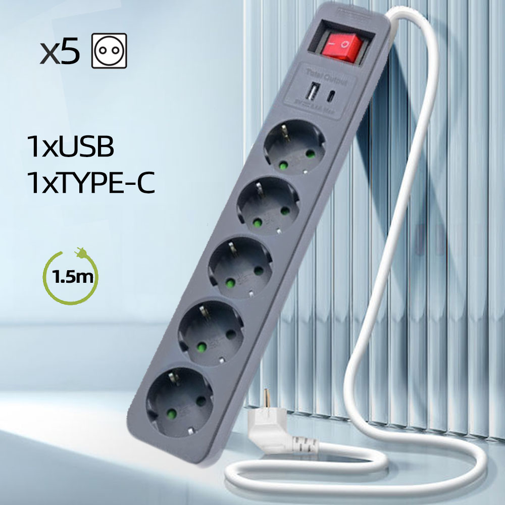 Πολύπριζο Lamtech 5Way Surge Protector With 1Xtype-C 1XUSB 5Xschuko Black/White 1.5M