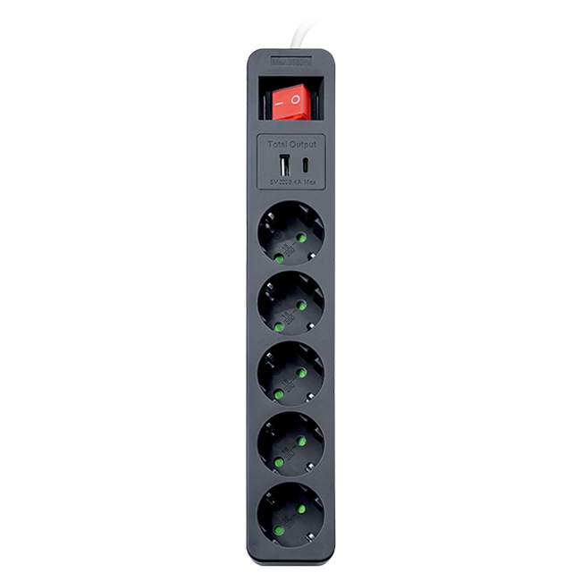 Πολύπριζο 5 θέσεων με διακόπτη ON/OFF και 2 θύρες USB (USB-C & USB-Α)Το πολύπριζο SONORA διαθέτει 5 υποδοχές τύπου σούκο για να συνδέσεις έως και 5 ηλεκτρικές συσκευές ταυτόχρονα. Οι υποδοχές σούκο είναι εξοπλισμένες με ασφάλεια για τα παιδιά, ενώ διαθέτει και διακόπτη ON/OFF για να απενεργοποιείτε το πολύπριζο όταν δεν το χρησιμοποιείτε. Διαθέτει επίσης 2 θύρες USB, μία Type-A και μία Type-C, για τροφοδοσία συσκευών μέσω καλωδίου USB ή για φόρτιση των επαναφορτιζόμενων συσκευών σας.Χαρακτηριστικά:- Έξοδοι Schuko: 5 με προστασία επαφών- Διακόπτης: Ναι- Τάση εισόδου: 250V~- Ρεύμα εισόδου (Schuko): 16A- Ισχύς (Schuko): 3680W- Ρεύμα εισόδου (USB): 3.4 A- Τάση εξόδου (USB): 5V DC- Ισχύς (USB): 17W- Τύπος καλωδίου: H05VV-F3G1.5mm2- Μήκος καλωδίου: περ. 1.4m- Χρώμα: Λευκό - Μαύρο- Εγγύηση: 2 χρόνια