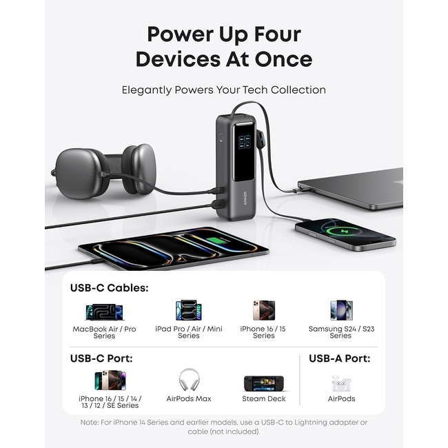 Ο Anker 25,000mAh 165W Max 3 x USB-C power bank έχει σχεδιαστεί για χρήστες που απαιτούν αξιόπιστη τροφοδοσία εν κινήσει. Με την ικανότητά του να φορτίζει πολλαπλές συσκευές ταυτόχρονα, συμπεριλαμβανομένων φορητών υπολογιστών και smartphone, αυτός ο power bank είναι ιδανικός για συχνά ταξίδια.
