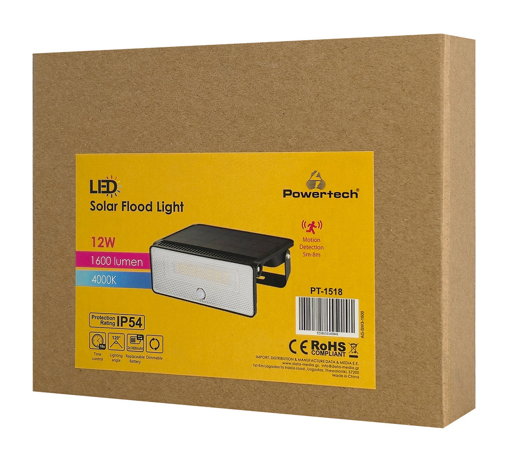 POWERTECH LED ηλιακό φωτιστικό PT-1518 με αισθητήρα κίνησης, 12W, 3600mAh, μαύρο