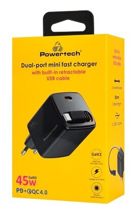 POWERTECH φορτιστής τοίχου PT-1572 με πτυσσόμενο καλώδιο, USB-C, 45W, GaN, μαύρος