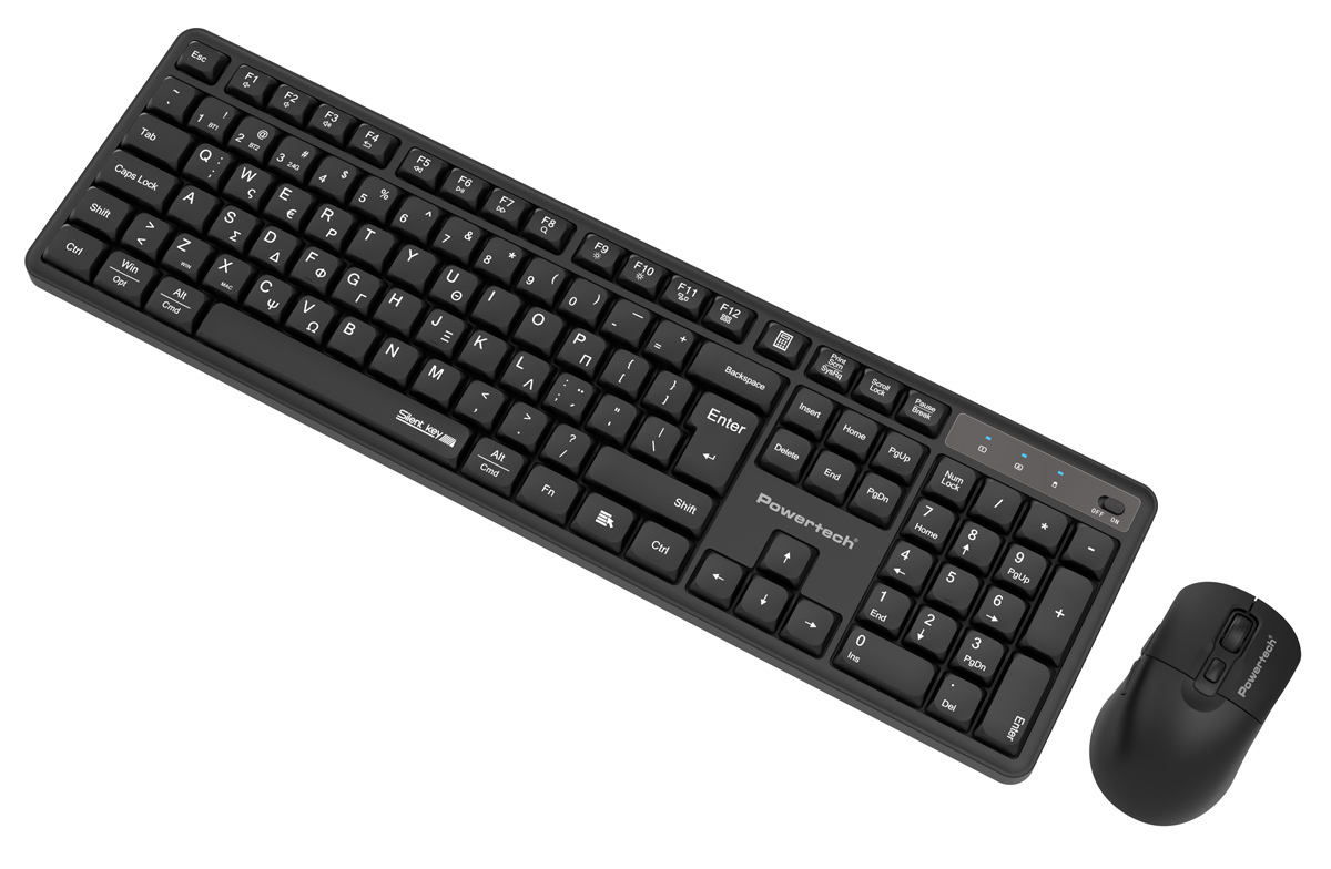 Set περιφερειακών της Powertech που αποτελείται από ασύρματο πληκτρολόγιο και ασύρματο οπτικό ποντίκι. Είναι συμβατά με συσκευές όπως desktop, laptop, tablet κ.λπ.