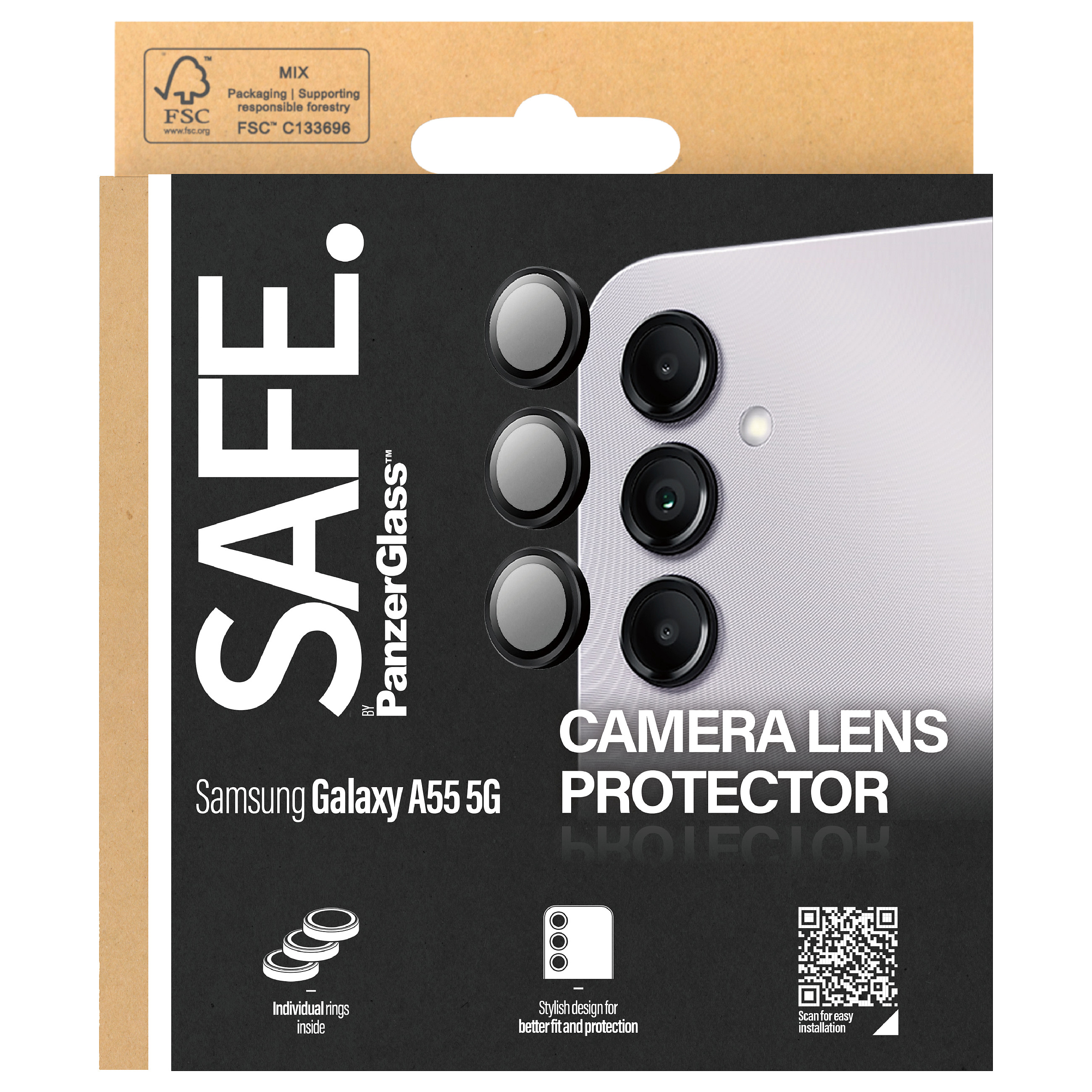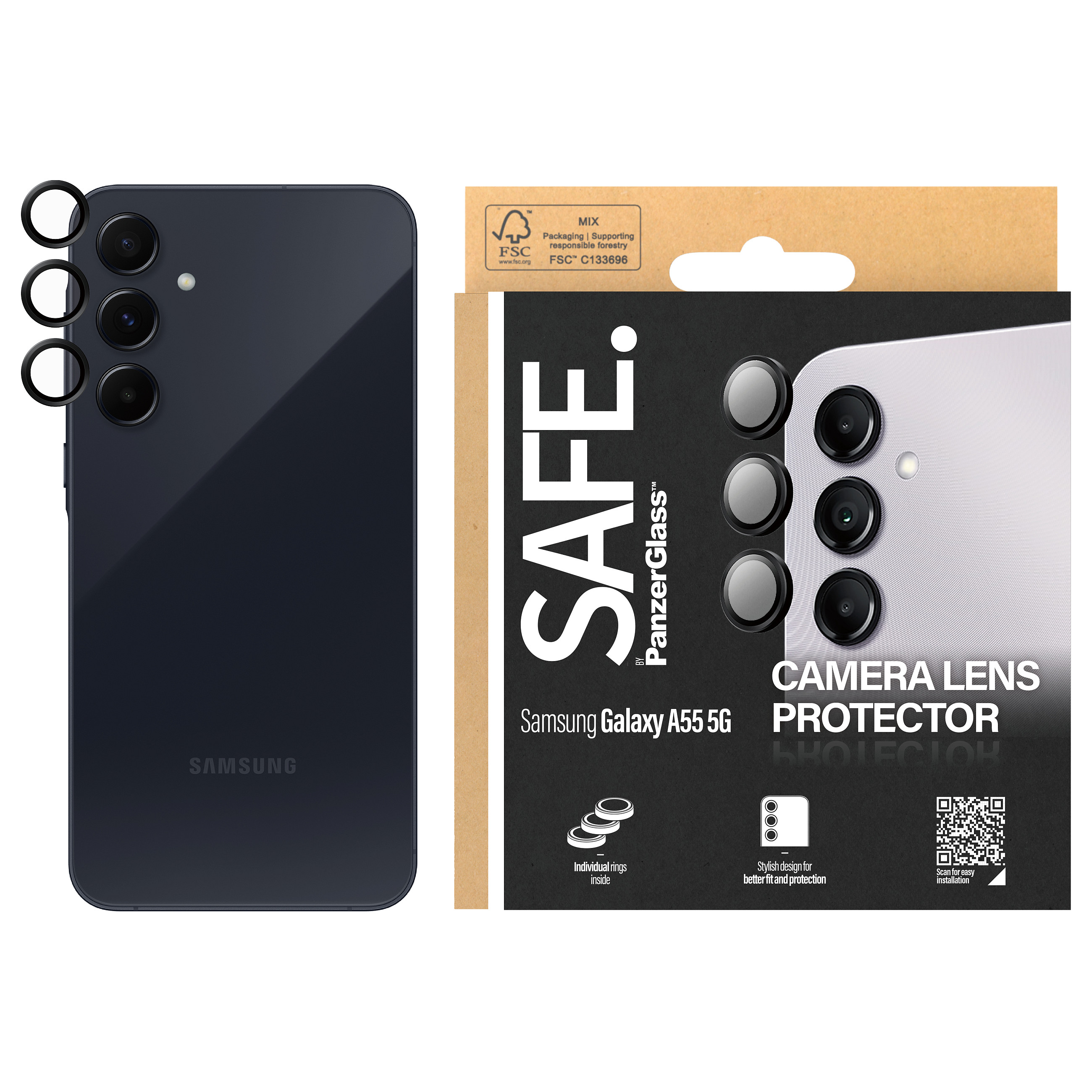 Το SAFE. by PanzerGlass® Camera Lens Protector είναι ένα απαραίτητο αξεσουάρ για το Samsung Galaxy A55 5G. Αυτό το premium προϊόν έχει σχεδιαστεί ειδικά για να προστατεύει τους οπίσθιους φακούς της κάμερας από πιθανές ζημιές.