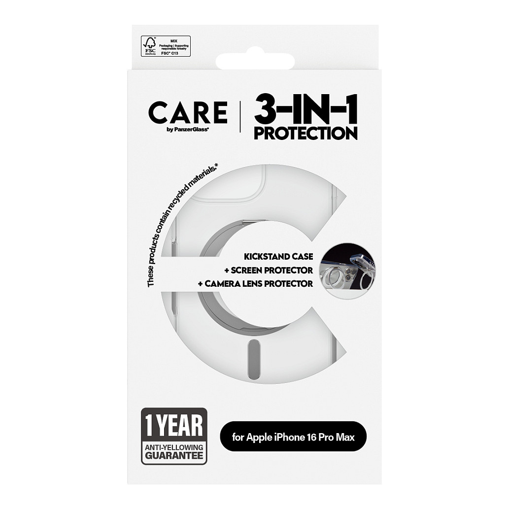 Το CARE Feature 3-in-1 Ceramic Bundle για το iPhone 16 Pro Max έχει σχεδιαστεί για να παρέχει ολοκληρωμένη προστασία για τη συσκευή σας. Αυτό το πακέτο περιλαμβάνει τρία βασικά στοιχεία: έναν κεραμικό προστατευτικό οθόνης, έναν προστατευτικό φακού Ceramic Hoops® και μια διαφανή θήκη με στήριγμα και συμβατότητα MagSafe.