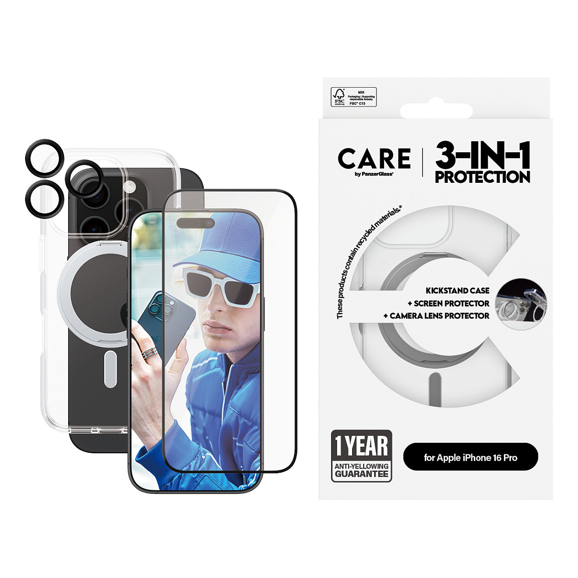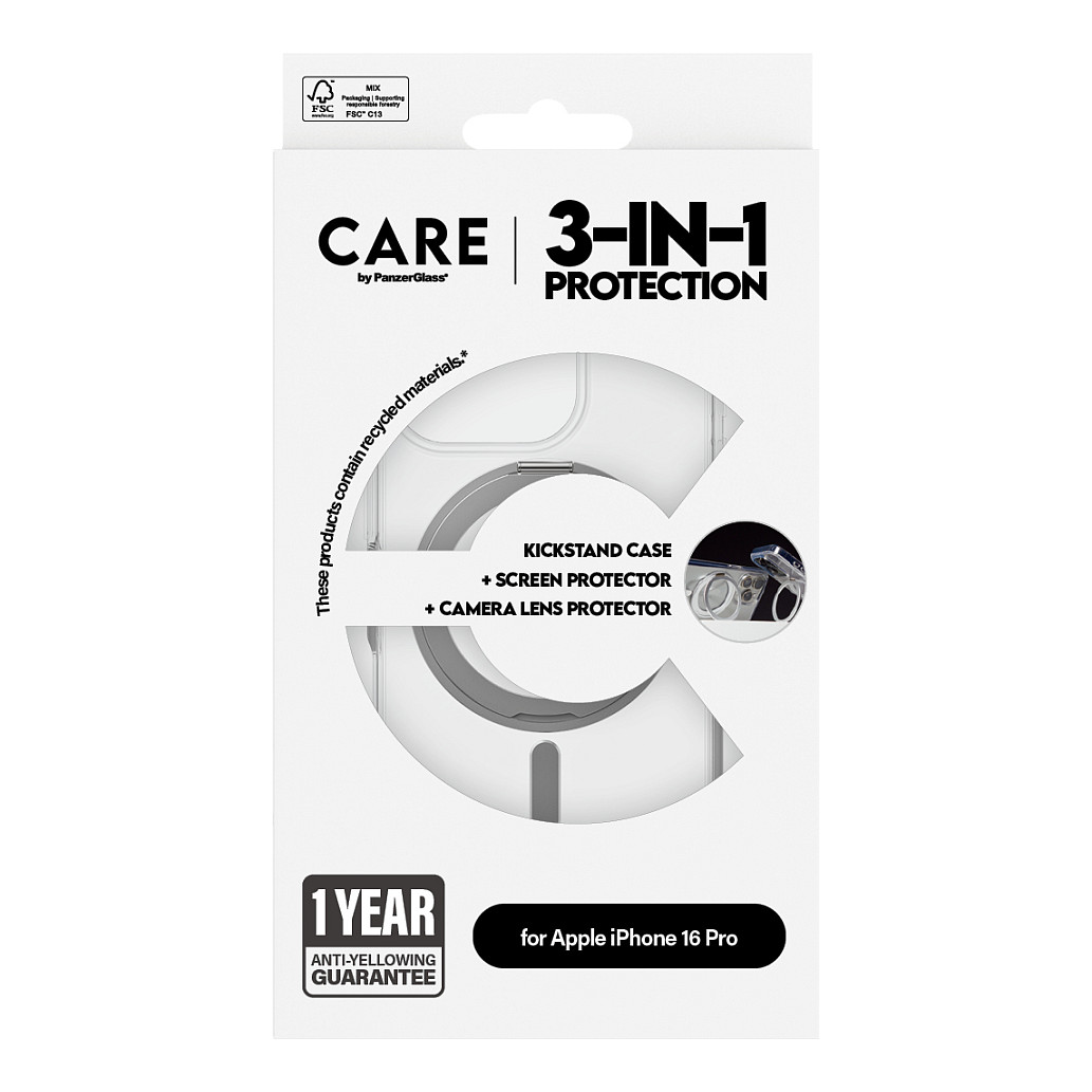 Το CARE Feature 3-in-1 Ceramic Bundle for iPhone 16 Pro είναι ένα ολοκληρωμένο πακέτο προστατευτικών αξεσουάρ σχεδιασμένο να προστατεύει τη συσκευή σας από διάφορους κινδύνους. Αυτό το πακέτο περιλαμβάνει έναν κεραμικό προστατευτικό οθόνης, έναν προστατευτικό φακού κάμερας και μια διαφανή θήκη με ενσωματωμένο σταντ, διασφαλίζοντας ότι το iPhone 16 Pro παραμένει σε άριστη κατάσταση.