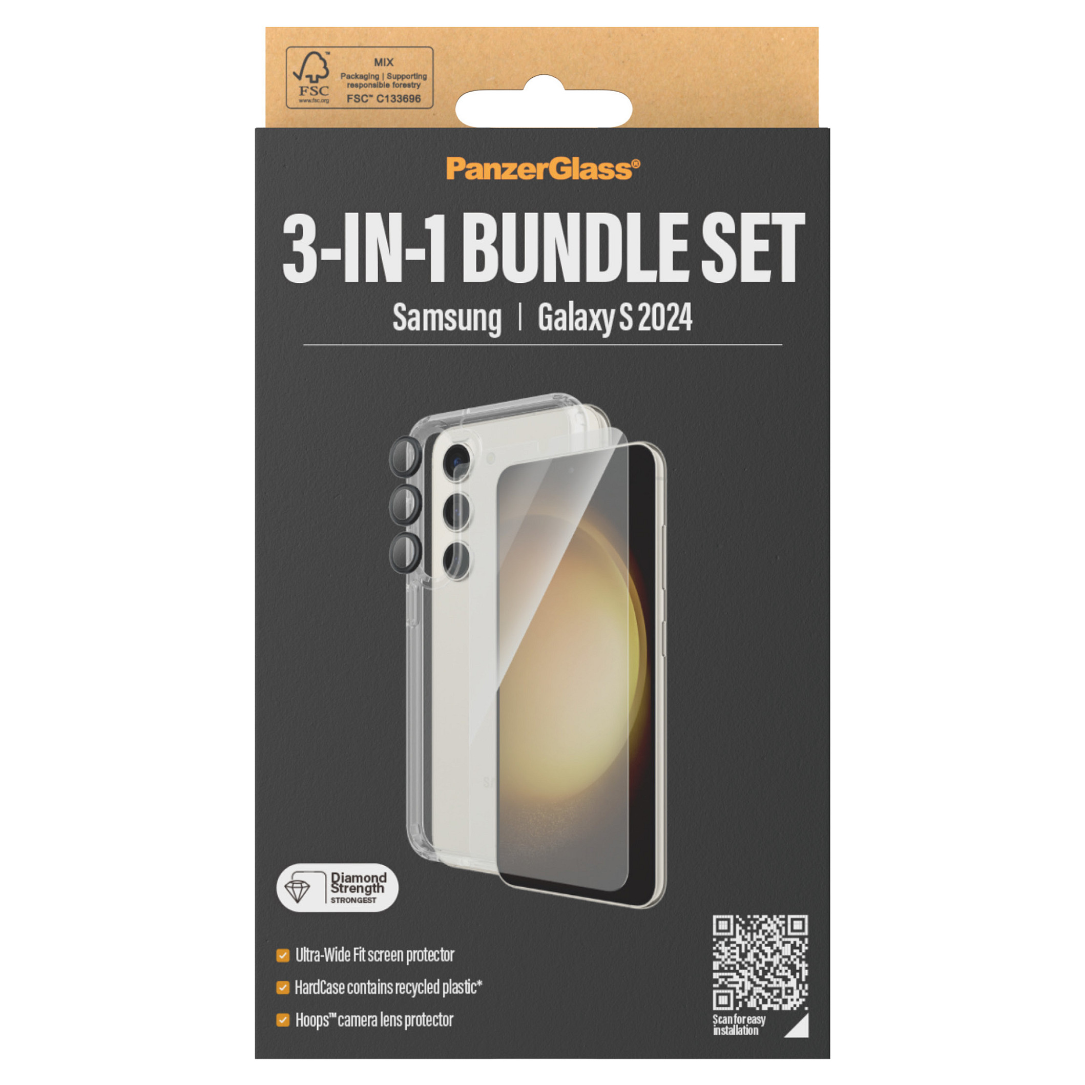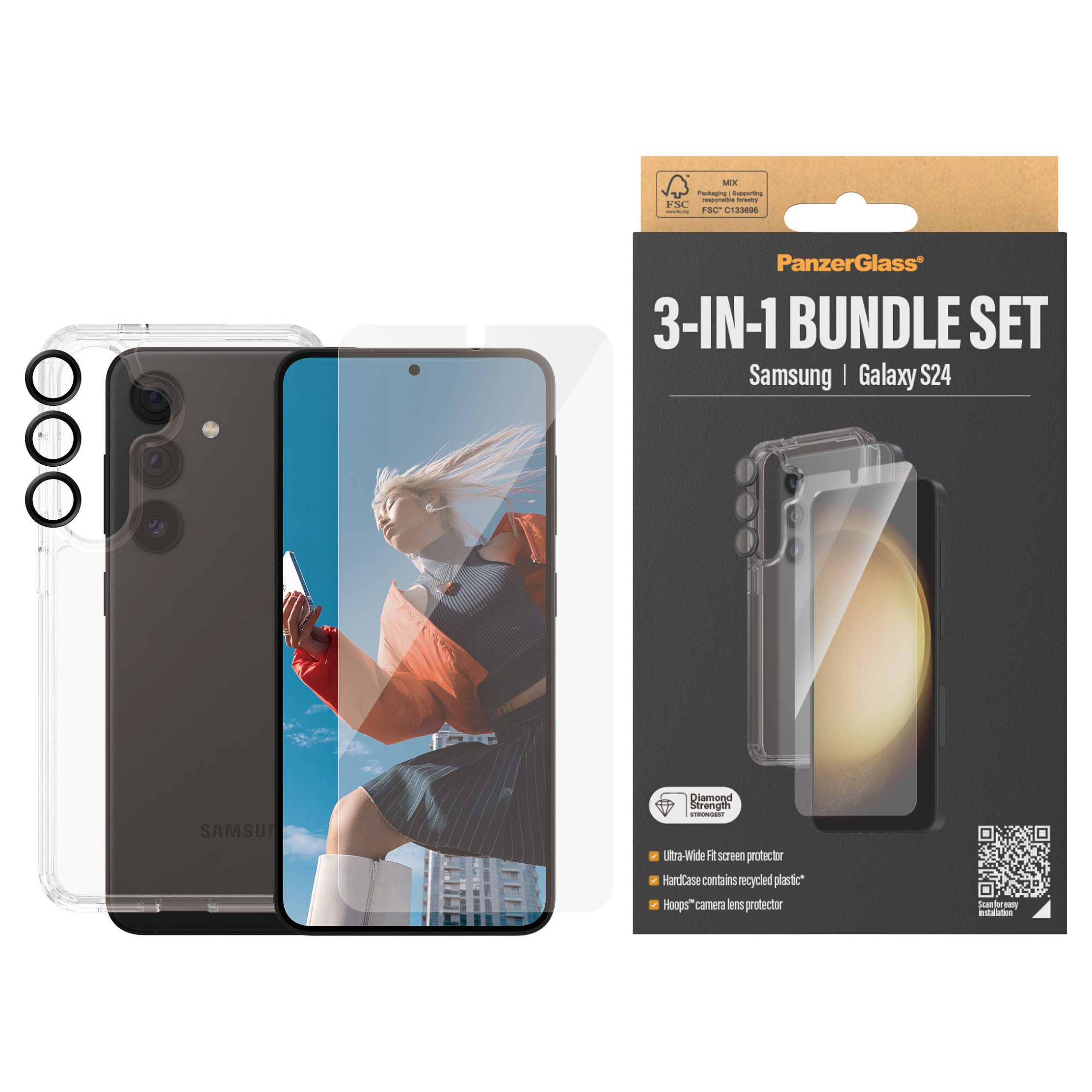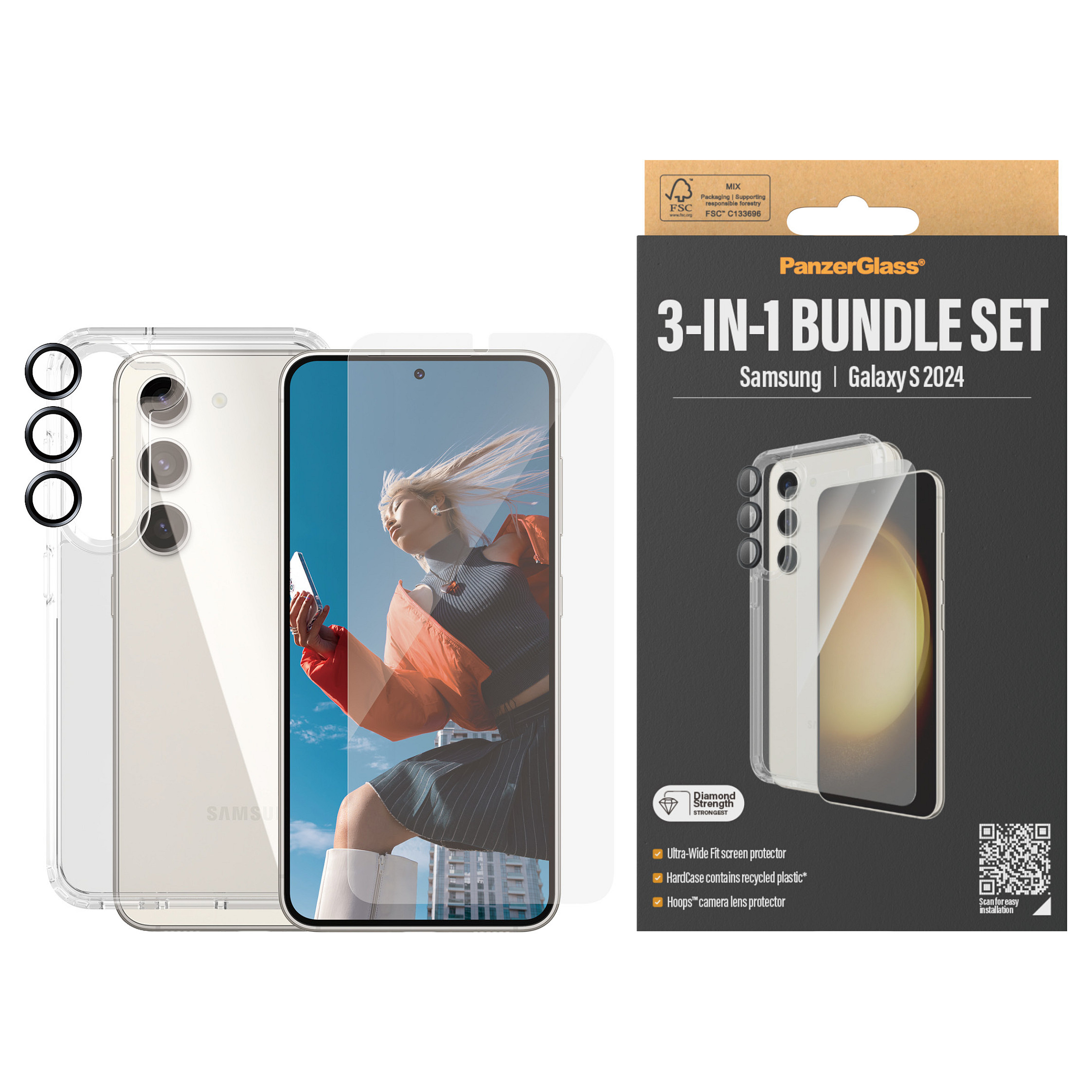 Το PanzerGlass 3-in-1 Protection Pack για το Samsung Galaxy S24 Ultra-Wide Fit είναι μια ολοκληρωμένη λύση σχεδιασμένη να προσφέρει ανώτερη προστασία για την συσκευή σας. Αυτό το πακέτο περιλαμβάνει μια θήκη HardCase συμβατή με ασύρματη φόρτιση, έναν Ultra-Wide Fit screen protector και έναν προστατευτικό φακού Hoops.