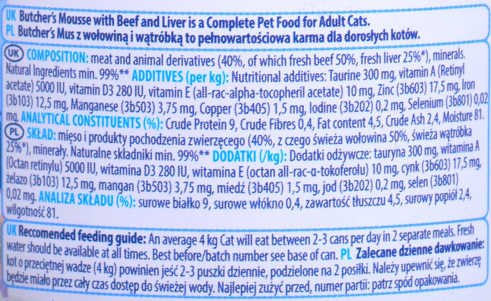 - Meat and animal products (40% of which 20% beef, 20% liver, 59% fresh meat)