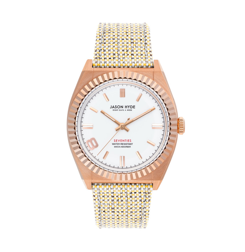 WOMAN WATCH JASON HYDE JH20013 (36MM). Type of mechanism: QUARTZ. Display: ANALOGICAL. Material of case: STAINLESS STEEL. Colour of case: PINK GOLD. Material of bracelet: TEXTILE. Colour of bracelet: BROWN. Dial Colour: WHITE. Glass type: MINERAL. Clousure: BUCKLE. Diameter of dial: 36MM. Submersible: 5ATM