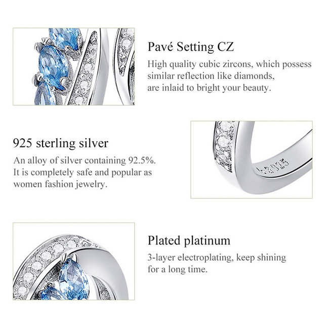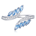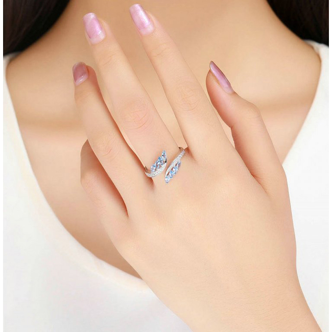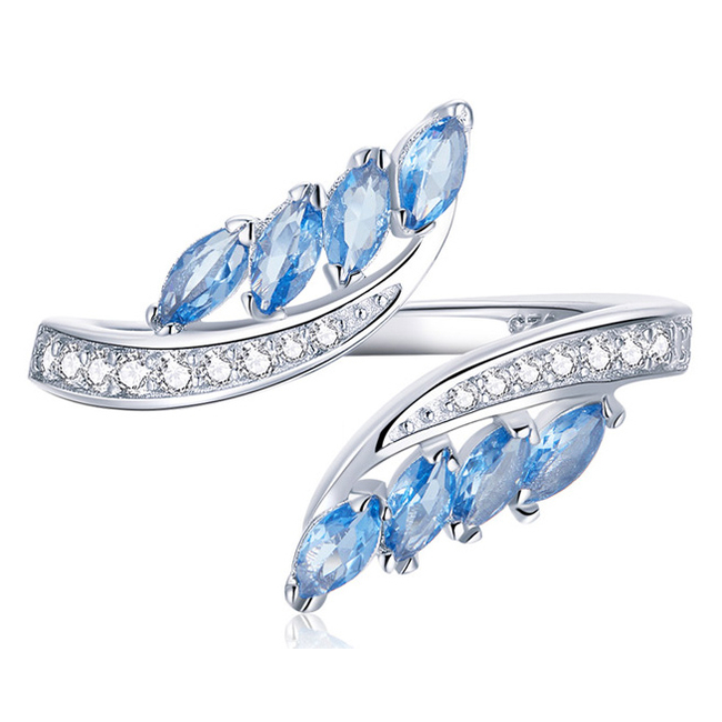 Κομψό δαχτυλίδι σε σχέδιο φύλλου ιτιάς, διακοσμημένο με αστραφτερή κυβική ζιρκόνια, λευκού και μπλε χρώματος, η οποία προσφέρει μοναδική λάμψη στο κόσμημα.