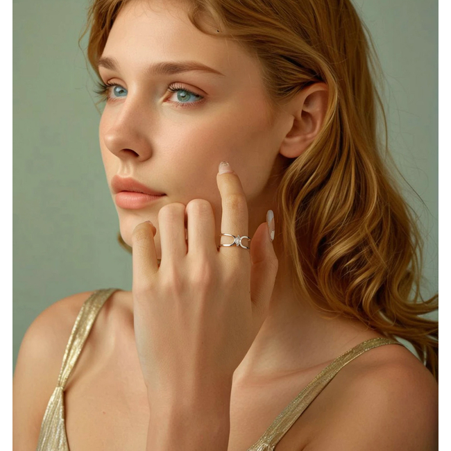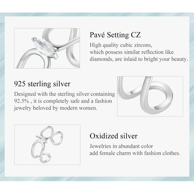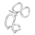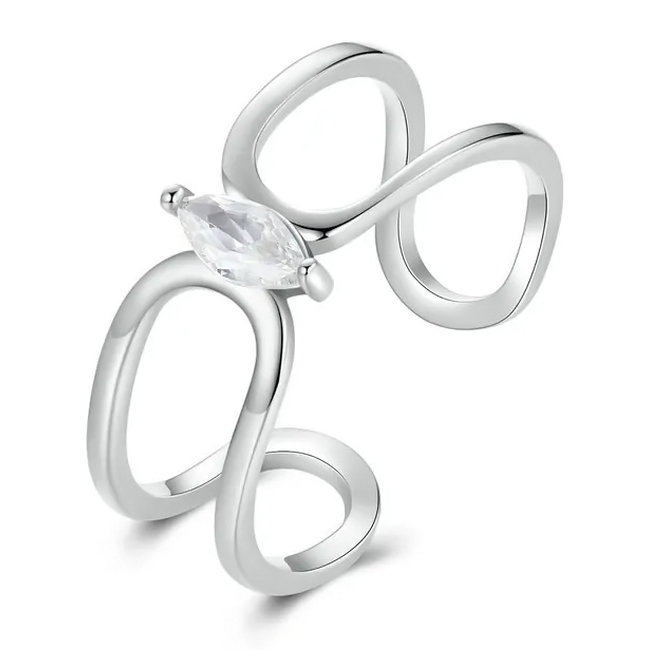 Εντυπωσιακό δαχτυλίδι σε σχήμα πεταλούδας, διακοσμημένο με αστραφτερή κυβική ζιρκόνια, λευκού χρώματος, η οποία αντανακλά μοναδικά το φως και προσφέρει λάμψη στο κόσμημα.