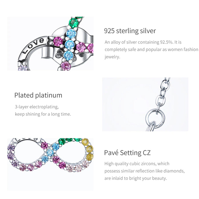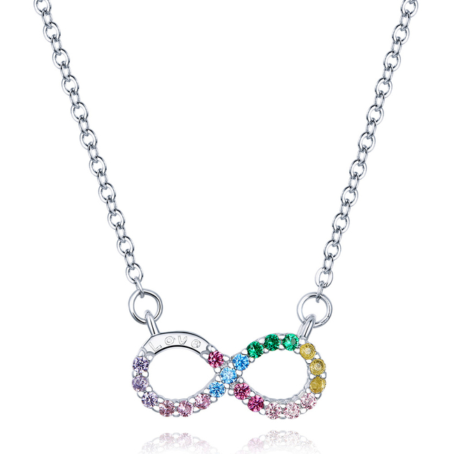 Εντυπωσιακό κολιέ με το σύμβολο του απείρου, σε ασημί χρώμα, διακοσμημένο με κυβική ζιρκόνια σε εντυπωσιακά χρώματα που προσφέρει εξαιρετική λάμψη στο κόσμημα.
