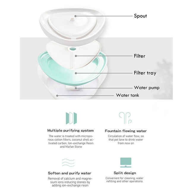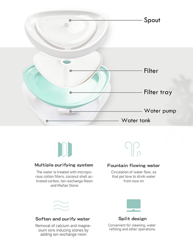 Εξοπλίζεται με κινητήρα που θέτει το νερό σε συνεχή κίνηση φιλτράροντάς το και καθαρίζοντας το από την υπερβολική τρίχα και τη βρωμιά.
