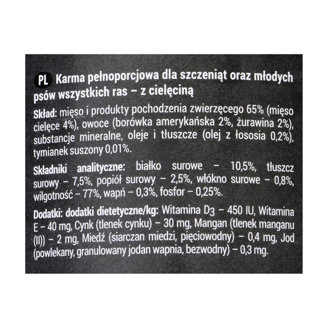 - meat and animal derivatives 65% (veal meat 4%), fruit (blueberry 2%, cranberry 2%), minerals, oils and fats (salmon oil 0.2%), dried thyme 0.01%