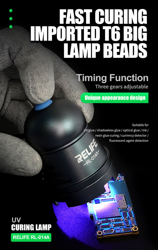 Λάμπα UV από την Relife, κατάλληλη για το στέγνωμα κόλλας UV. Διαθέτει 3 επίπεδα φωτεινότητας και timing λειτουργία. Η τροφοδοσία του γίνεται μέσω καλωδίου USB το οποίο είναι ενσωματωμένο πάνω στην λάμπα.