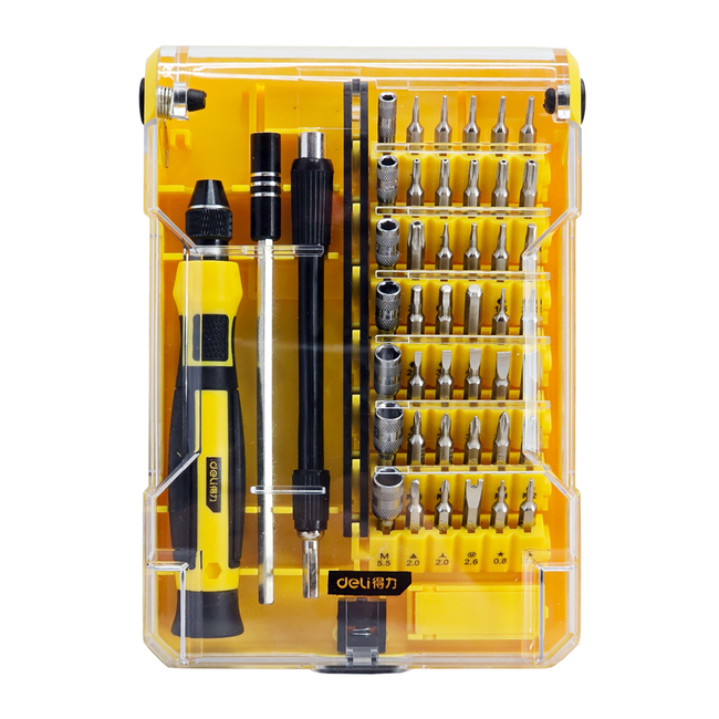 Σετ της Deli το οποίο αποτελείται από 1 κατσαβίδι, 2 αντάπτορες επέκτασης και 42 διαφορετικές μύτες κατσαβιδιού.