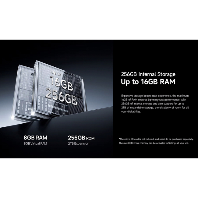 Με 8GB (+8GB virtual) RAM και 256GB ROM για να αποθηκεύετε τα αγαπημένα σας αρχεία, φωτογραφίες και βίντεο. Επιπλέον, προσφέρει την δυνατότητα να επεκτείνετε τον χώρο αποθήκευσης του smartphone με κάρτα micro SD έως 2TB.
