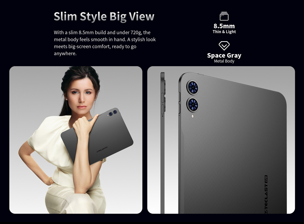 Με ελαφρύ και λεπτό μεταλλικό σώμα, το tablet T65 είναι άνετο στη χρήση και εύκολο να μεταφέρεται παντού.