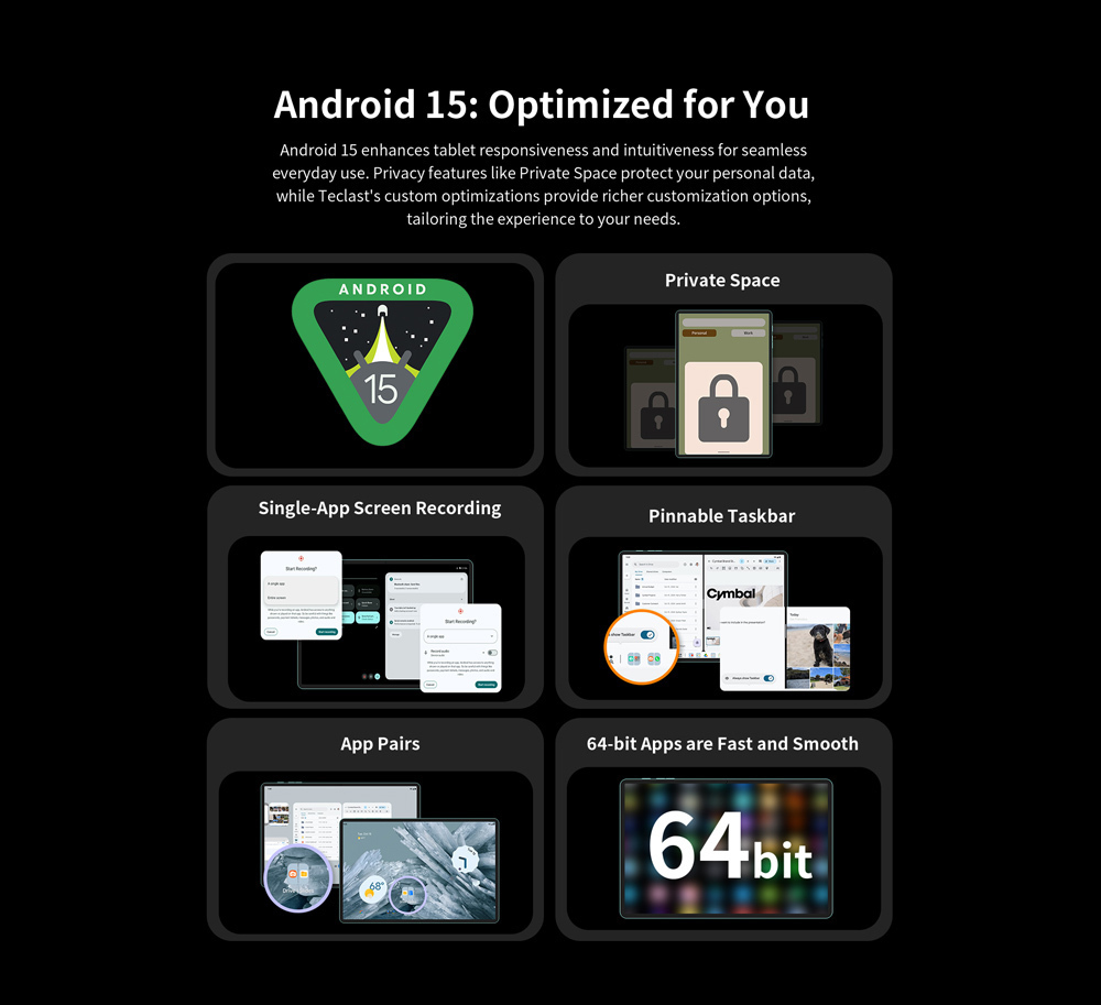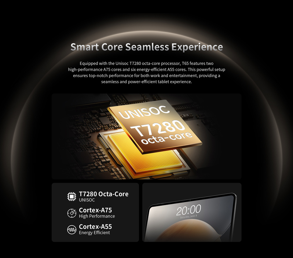 Εξοπλισμένο με επεξεργαστή 8 πυρήνων και λειτουργικό Android 15, το T65 προσφέρει υψηλή απόδοση για απρόσκοπτη περιήγηση στο διαδίκτυο, παιχνίδια, πολυμέσα και πολλά άλλα.
