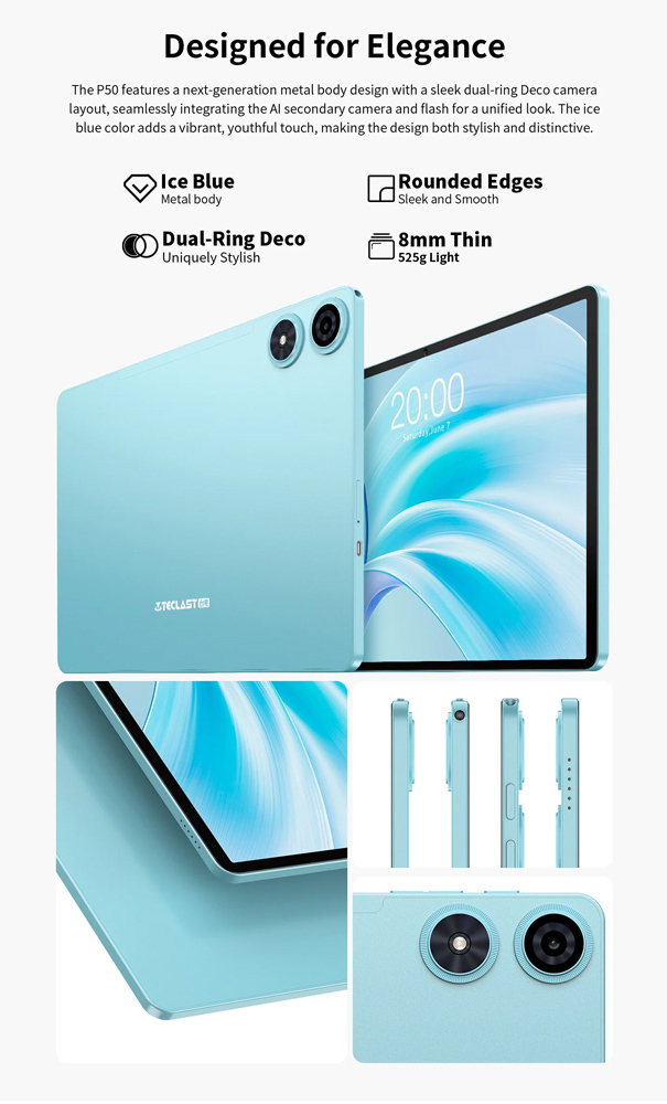 Το tablet P50 της Teclast συνδυάζει εντυπωσιακές επιδόσεις και εκλεπτυσμένο σχεδιασμό. Με μεγάλη οθόνη 11", ευέλικτο σύστημα λειτουργικού Android 15 και ισχυρό οκταπύρηνο επεξεργαστή, το P50 προσφέρει υψηλή απόδοση, για απρόσκοπτη περιήγηση στο διαδίκτυο, παιχνίδια, πολυμέσα και πολλά άλλα.