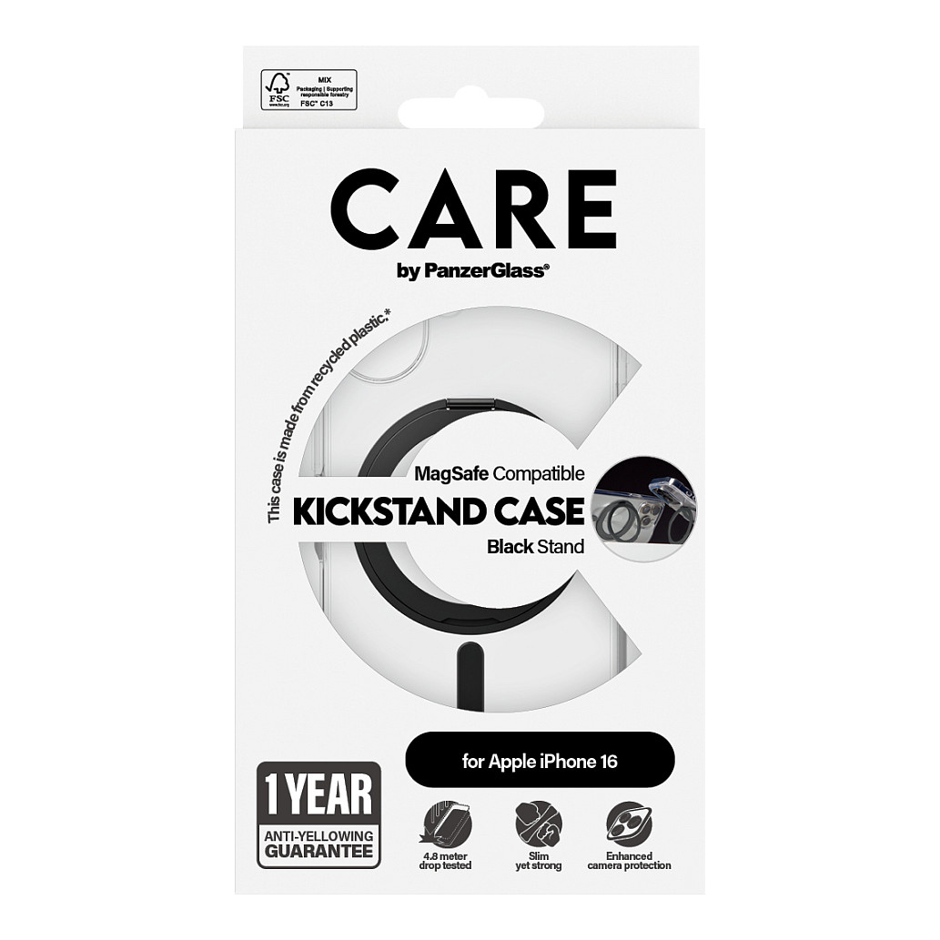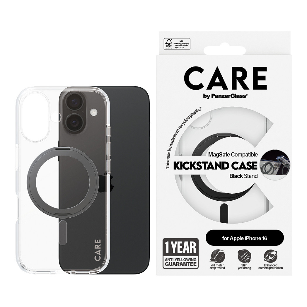 Η CARE by PanzerGlass® Feature Case Black Kickstand MagSafe για iPhone 16 δεν είναι απλώς μια προστατευτική θήκη· είναι ένα μείγμα βιωσιμότητας και λειτουργικότητας.