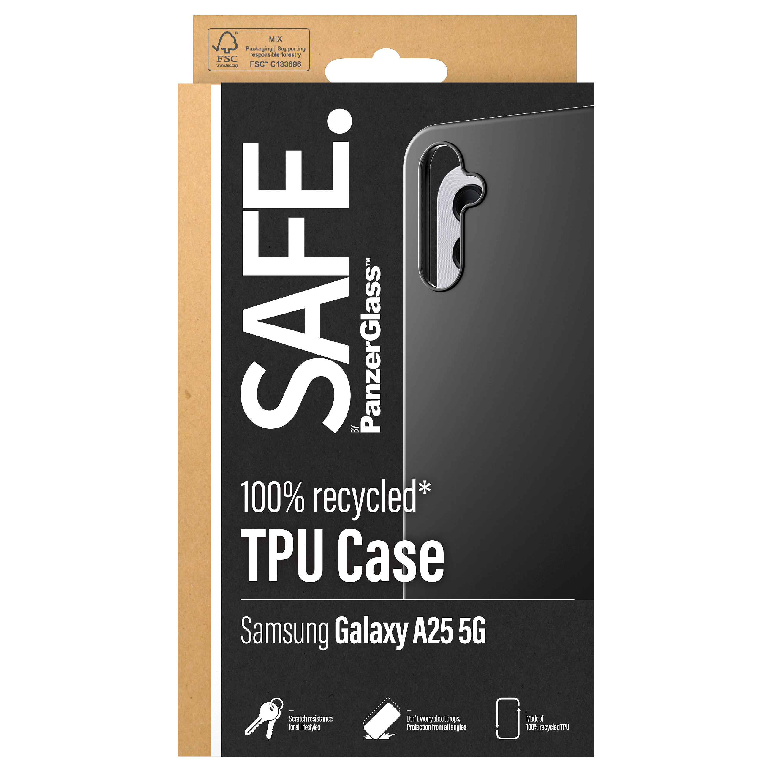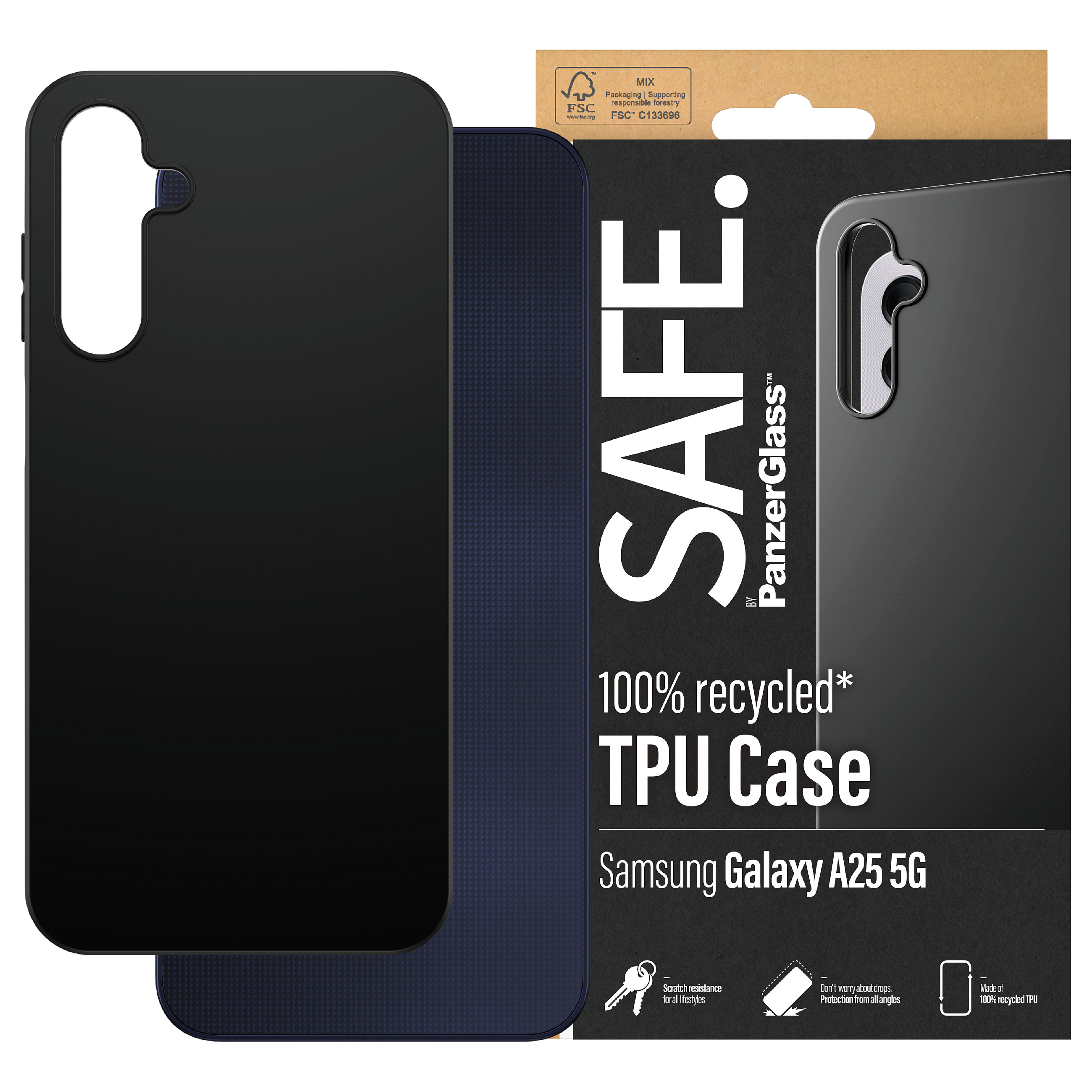 Η SAFE. by PanzerGlass Case Samsung A25 5G Black είναι ένα αξιοσημείωτο αξεσουάρ σχεδιασμένο να ενισχύει τη διάρκεια ζωής της συσκευής σας. Κατασκευασμένο από 100% ανακυκλωμένο πλαστικό, αυτή η μαλακή θήκη TPU ενσωματώνει τόσο στυλ όσο και λειτουργικότητα, κάνοντάς την ιδανική επιλογή για χρήστες του Samsung Galaxy A25 5G.