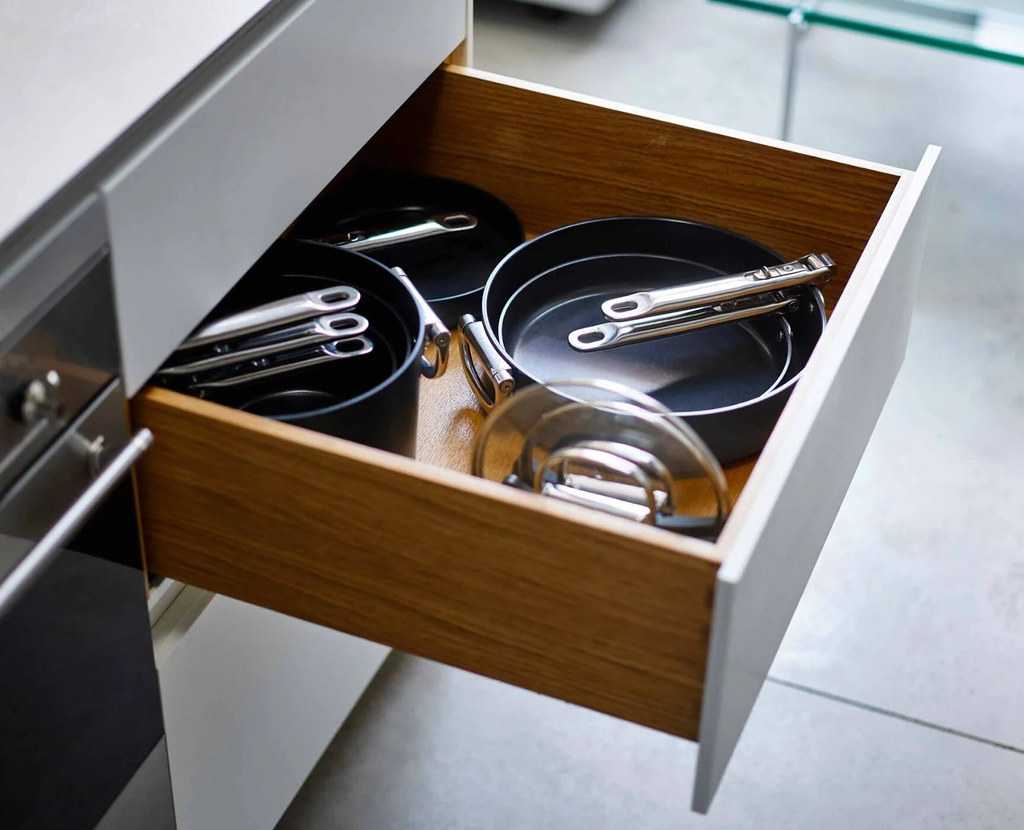 Ένα άλλο αξιόλογο χαρακτηριστικό είναι η αναδιπλούμενη από ανοξείδωτο ατσάλι λαβή που χρησιμοποιεί την πατενταρισμένη τεχνολογία SwingLock. Αυτό επιτρέπει την σημαντική εξοικονόμηση χώρου αποθήκευσης, διπλώνοντας τη λαβή, καθιστώντας το έως 50% πιο συμπαγές από τα παραδοσιακά τηγάνια.