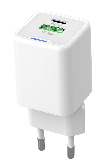 Υψηλής απόδοσης φορτιστής τοίχου της Powertech, κατασκευασμένος από ανθεκτικό υλικό και συμβατός με συσκευές που φορτίζουν μέσω θύρας USB. Διαθέτει USB και USB-C θύρες εξόδου που υποστηρίζουν φόρτιση με μέγιστη συνολική απόδοση 33W.