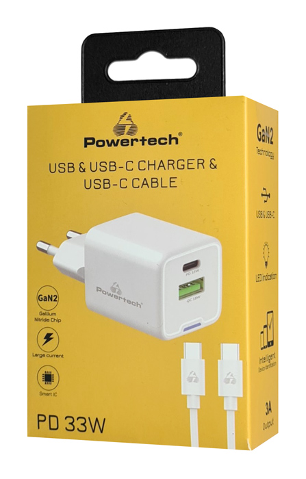 POWERTECH φορτιστής τοίχου PT-1224, καλώδιο, USB/USB-C, 33W, GaN, λευκός