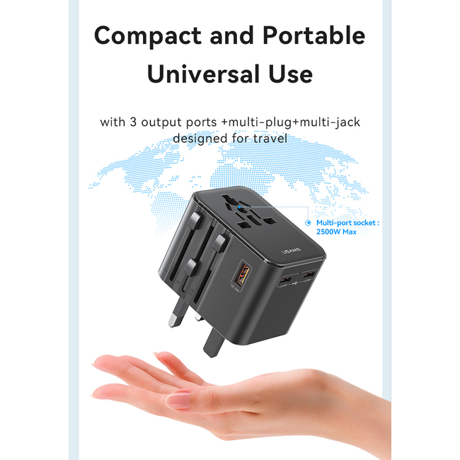 Φορτιστής & αντάπτορας πρίζας από την Usams, κατάλληλος για χρήση με τύπους πριζών US, AU, EU και UK. Η εναλλαγή της πρίζας γίνεται εύκολα με συρόμενο κουμπί και διαθέτει διπλή ασφάλεια. Εξοπλίζεται με 1x USB και 2x USB-C θύρες εξόδου, για την φόρτιση συσκευών, με μέγιστη απόδοση 25W.