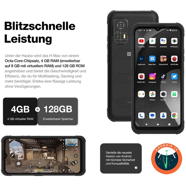 Το AGM Mobile H MAX Outdoor Rugged Smartphone είναι μια ανθεκτική και πολυχρηστική συσκευή, ειδικά σχεδιασμένη για τους λάτρεις των εξωτερικών δραστηριοτήτων. Αυτό το smartphone είναι κατασκευασμένο για να αντέχει σε δύσκολες συνθήκες, καθιστώντας το ιδανικό για περιπετειώδεις χρήστες και αυτούς που εργάζονται σε απαιτητικά περιβάλλοντα.