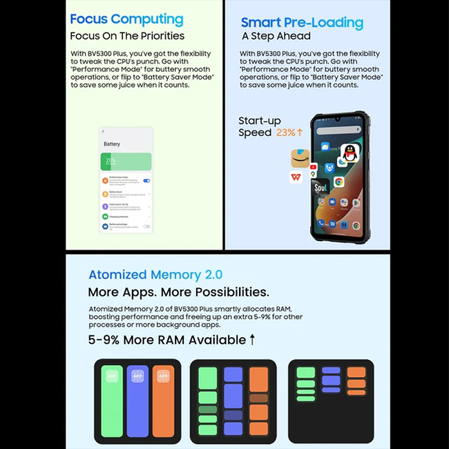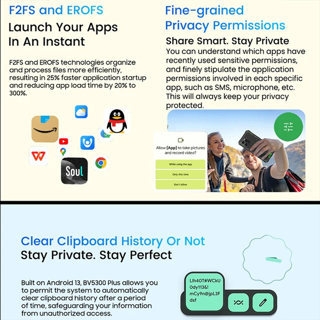 Η συσκευή προσφέρει εξαιρετικές δυνατότητες αντοχής στο νερό και στους κραδασμούς, με πιστοποίηση IP68 και IP69K καθώς και πιστοποίηση MIL-STD-810H. Οι χρήστες μπορούν να βασιστούν στη διάρκεια ζωής του BV5300 Plus, ανεξάρτητα από το περιβάλλον.