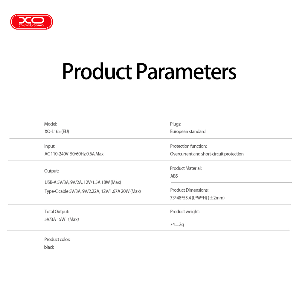 USB-A Output5V/3A, 9V/2A, 12V/1.5A, 18W Max
