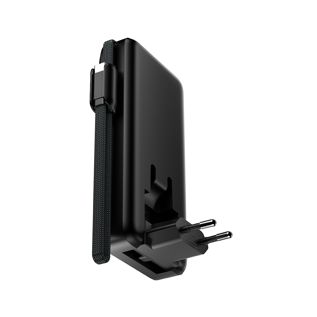 FeaturesFast charging, integrated AC plug, built-in Type-C cable, wrist strap