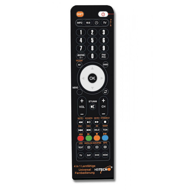 HEITECH 10000081 ΧΕΙΡΙΣΤΗΡΙΟ "4 ΣΕ 1'' UNIVERSAL - Πλήρης έλεγχος των συσκευών ψυχαγωγίας σας - Υποστηρίζει TV / DVD / (όλα τα είδη) δέκτη AV SAT - Έλεγχος μέχρι 4 μονάδες - Εύκολος προγραμματισμός - Αυτόματη λειτουργία αναζήτησης - Πρόσθετη αναζήτηση για συσκευές μάρκας τηλεόρασης - Έτοιμο με 2 μπαταρίες Micro / AAA / LR3 (δεν περιλαμβάνονται) - Εγχειρίδιο με μια μεγάλη ενσωματωμένη βάση δεδομένων κώδικα - Χρώμα: μαύρο