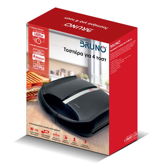Η Ψηστιέρα-Τοστιέρα για 4 τοστ BRUNO BRN-0216 είναι ιδανική για ψήσιμο τοστ, σπιτικών σάντουιτς και άλλων snack σε σύντομο χρόνο.