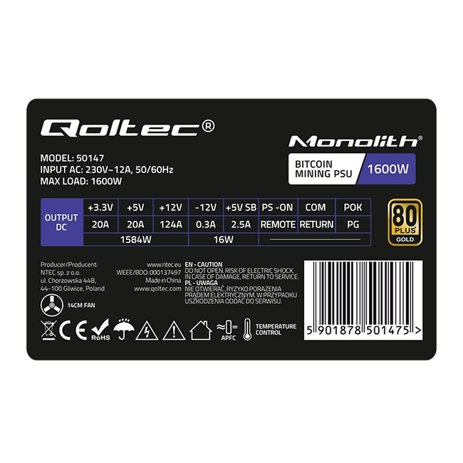 Τροφοδοτικό Qoltec Atx | 1600w | 80 Plus Gold | Bitcoin Miner